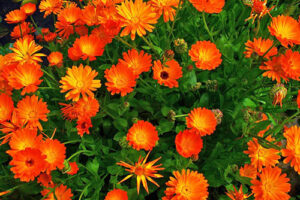 ترکیبات موجود در گل های همیشه بهار شامل فلاونوئیدها، مانند فلاونول و فلاونول گلایکوزیت، شامل ایزوکورسیترین، نارسیسین، نئولیس پروسید و روتین، روغن فرار و باسکویی ترپن (به عنوان اجزاء اصلی و نیز محتوی منتول، ایزومنتول، ) کاریوفیلن، تریپنوئیدها مانند ساپونین ها، اولئانولیک اسید به عنوان یک آگلیکن و مواد دیگری مانند استرول ها موجود به صورت الکل های آزاد، استرها و گلیکوسیدها، کومارین هایی مانند اسکوپولتین، آمبلی فرون و آئسکولتین، کاروتنوئیدها و پلی ساکاریدها است.