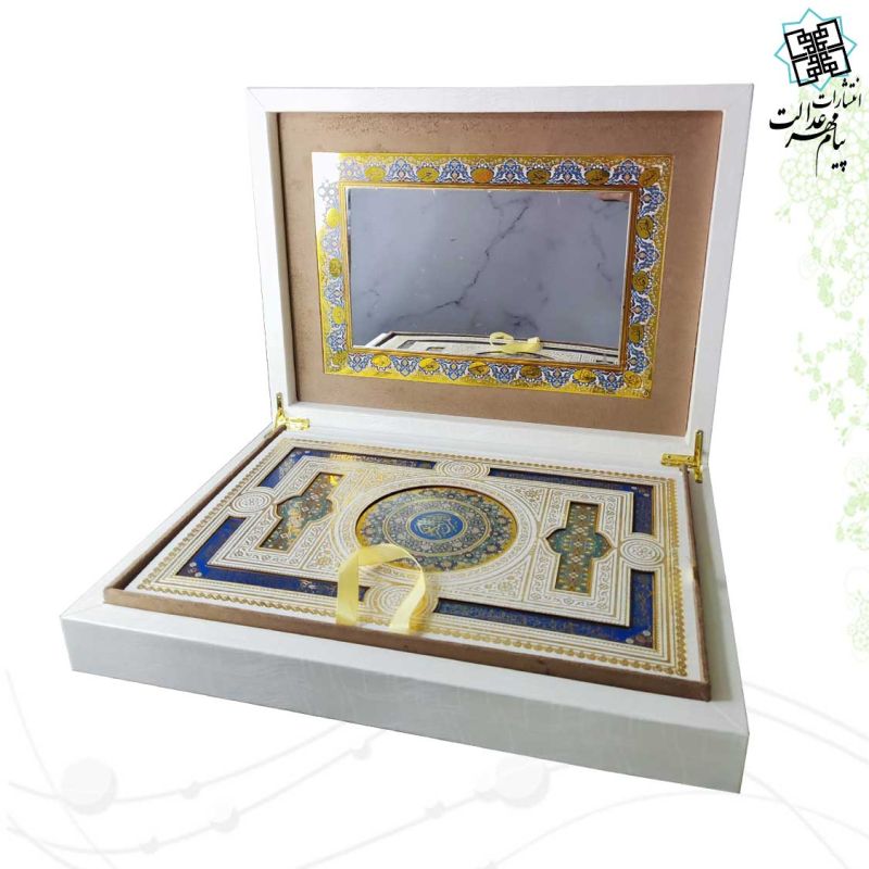 قرآن رحلی بدون ترجمه گلاسه گالینگور سفید آینه دار جعبه لپتاپی پلاک دار